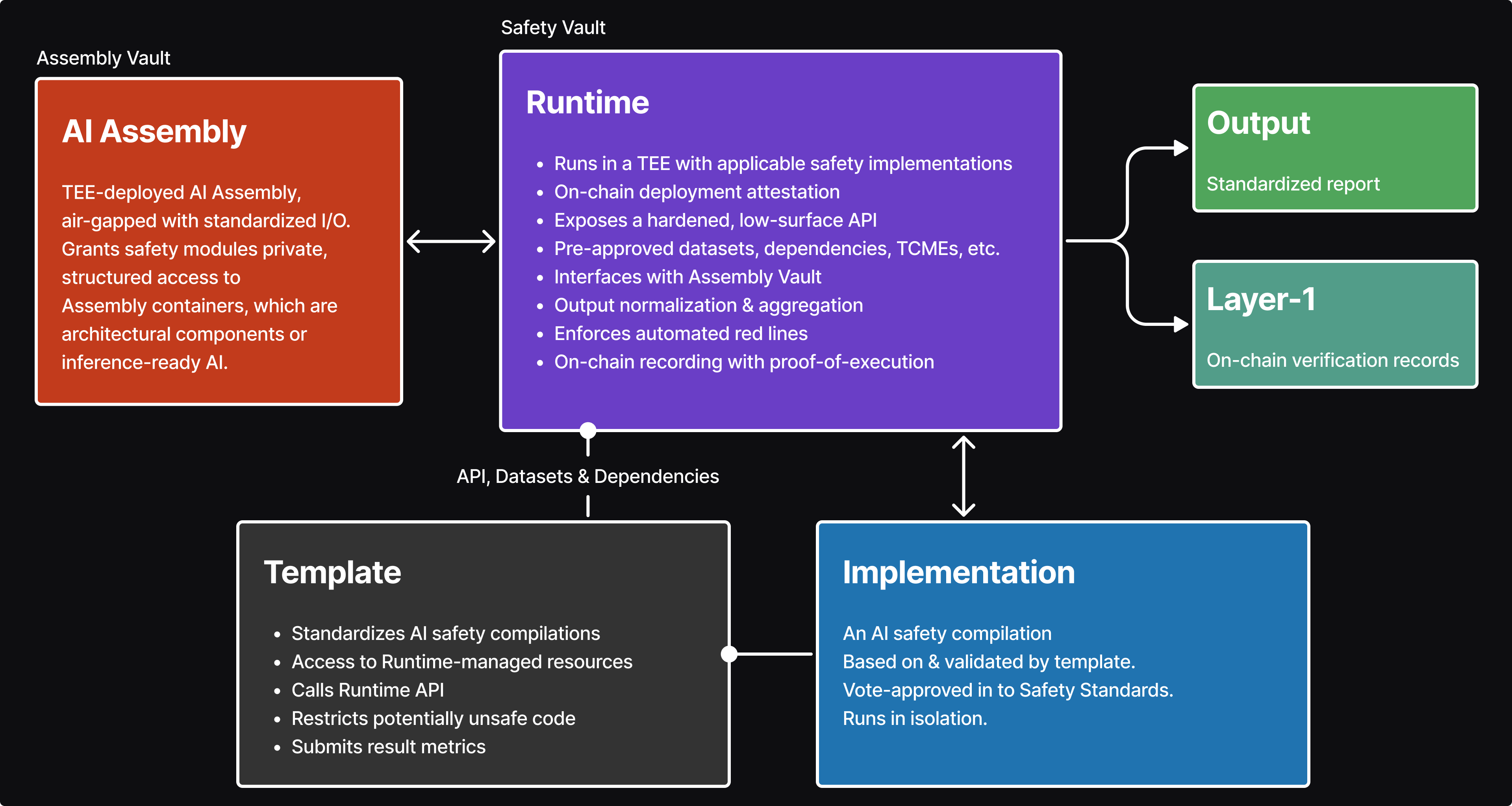 Blockchain Layer-2 ZK-Rollups handle iterative development and voting for probes, audits, and templates - avoiding overload on the Layer-1 mainnet. Once voted in to The Safety Standards, these become immutable on Layer-1. They can only be removed/replaced via voting, ensuring adaptability while maintaining security and trust. As security is paramount, interactive zero-knowledge proofs are used over faster non-interactive zero-knowledge proof (NIZK) as well as quantum-resistant encryption.